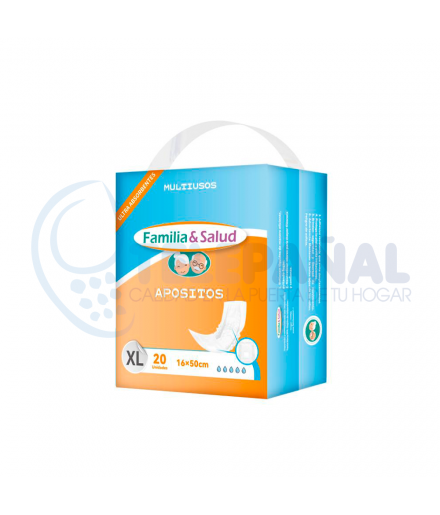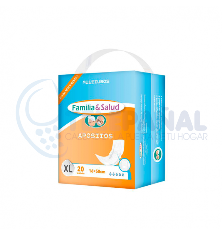 Apósitos talla XL para incontinencia leve y moderada, con absorción leve a moderada y adhesivos para mejor ajuste.